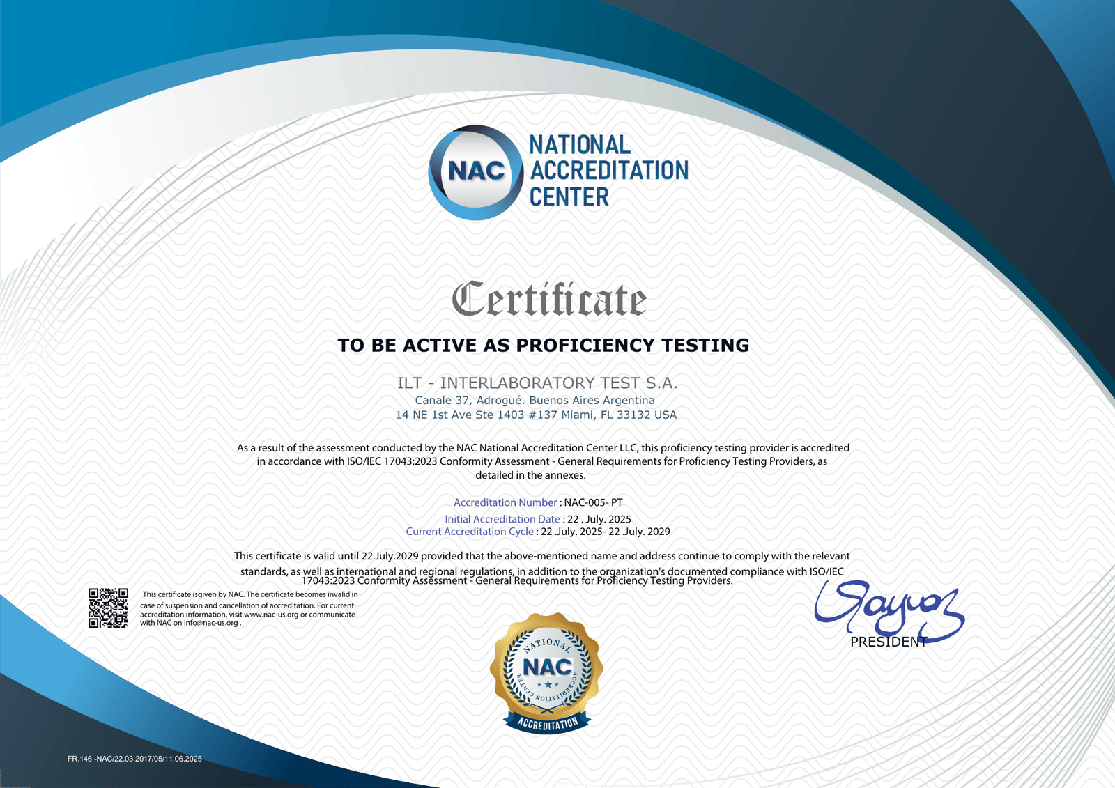At ILT – Interlaboratory Test, we hold accreditation granted by the National Accreditation Center (NAC) under the international standard ISO/IEC 17043:2023, with accreditation code NAC-005-PT.